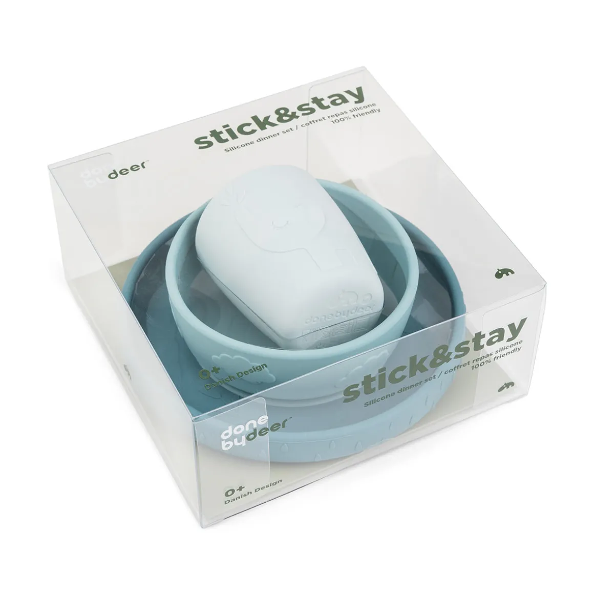 Vores Stick&Stay spisesæt er skabt med omtanke for de små. Sættet, der består af en tallerken, en skål og et minikrus, har dejlige blå nuancer med prægede Deer friends-detaljer. Sugebasen på skålen og tallerkenen sikrer stabilitet under måltiderne, forhindrer spild og gør det lettere at spise.