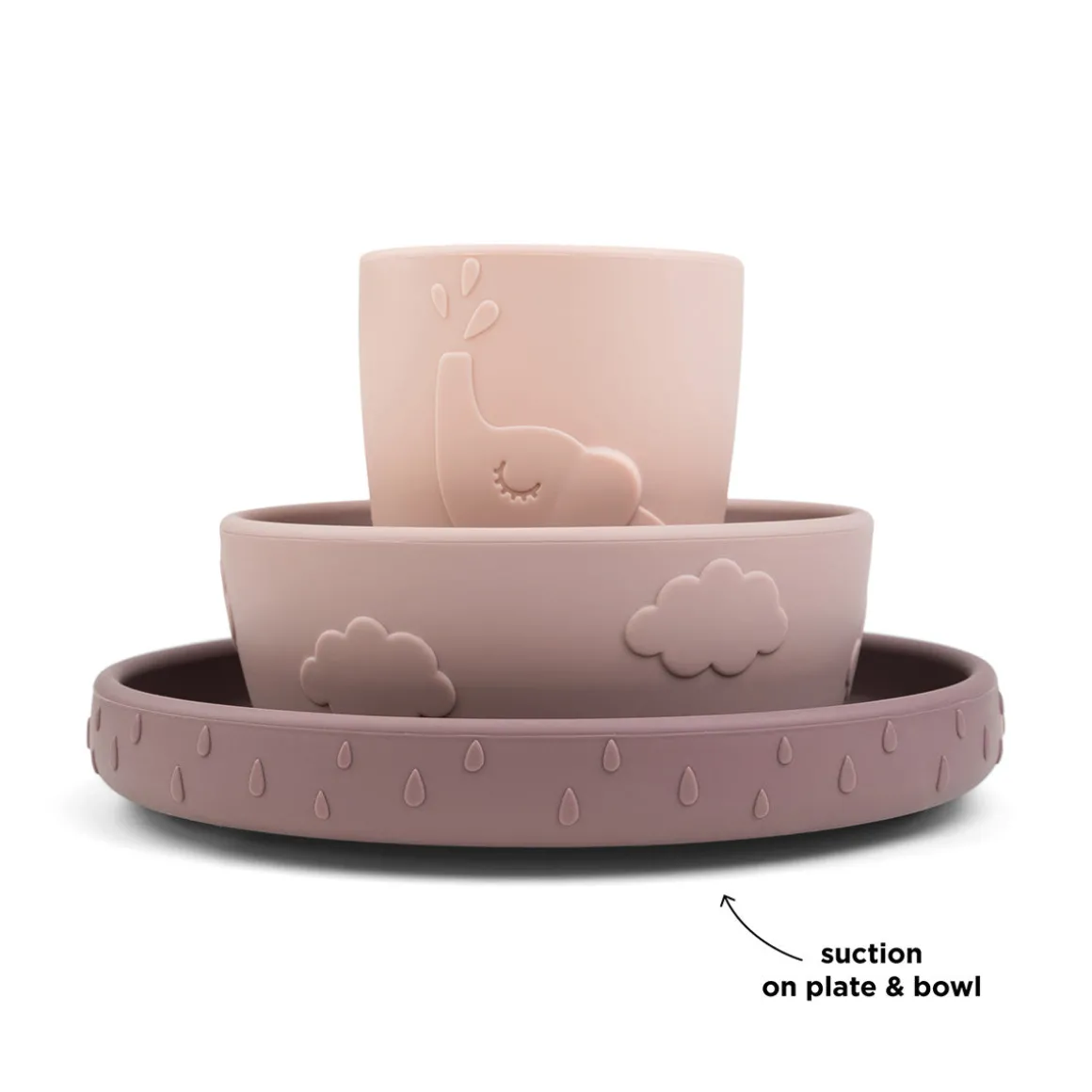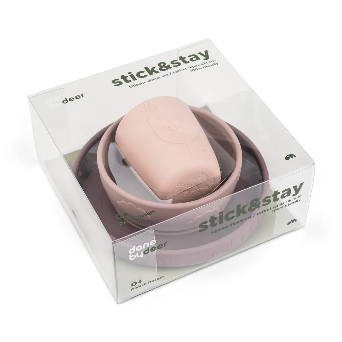 Vores Stick&Stay spisesæt er skabt med omtanke for små spisere. Sættet, der består af en tallerken, en skål og et minikrus, har bløde pudderfarver med prægede Deer friends-detaljer. Sugebasen på skålen og tallerkenen sikrer stabilitet under måltiderne, forhindrer spild og gør det lettere at spise.