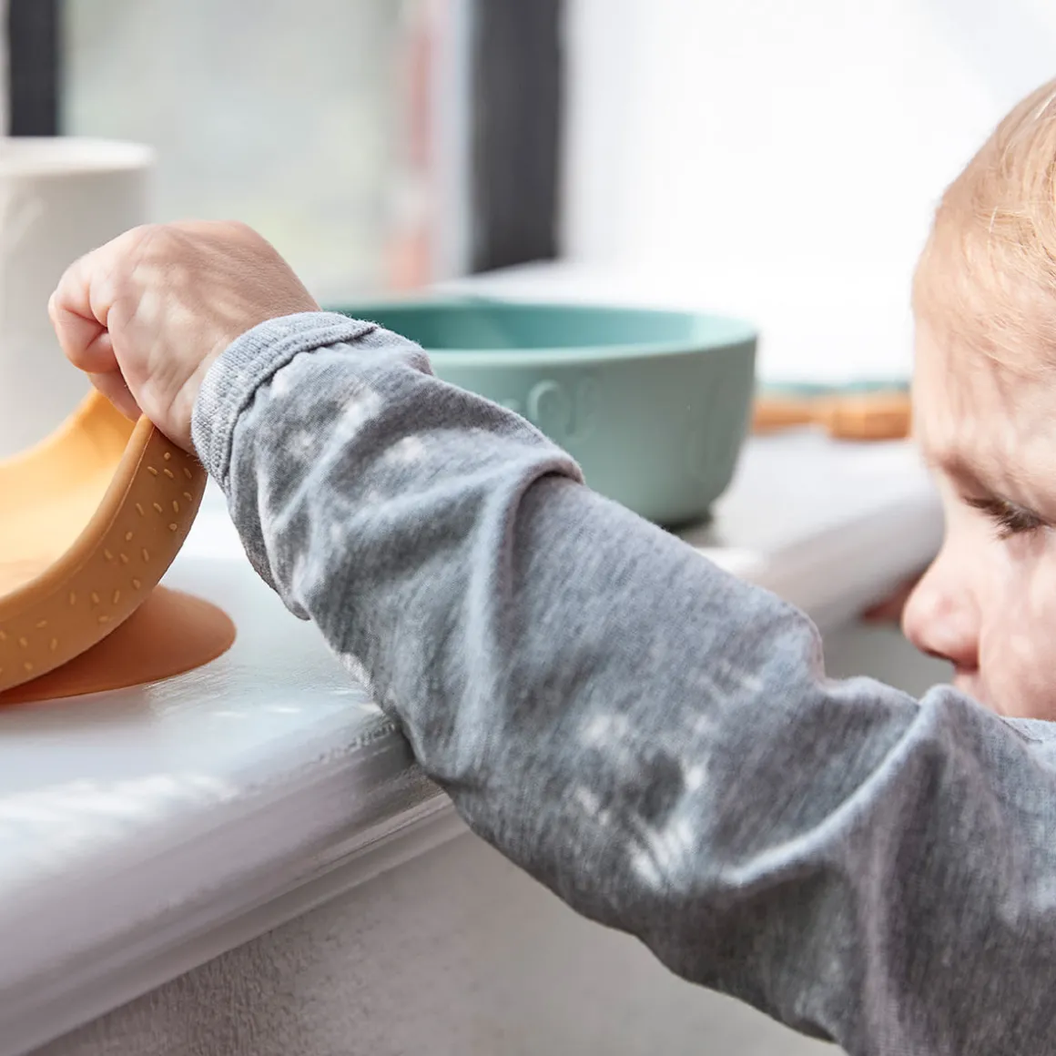 Tryk sennepssilikone tallerkenen og skålen ned, og de vil klæbe til de fleste glatte overflader med naturligt sug. Dette forhindrer børn i at skubbe, vælte eller kaste dem. Stellet med lamaen og fuglen er en perfekt gaveidé til småspisere.
