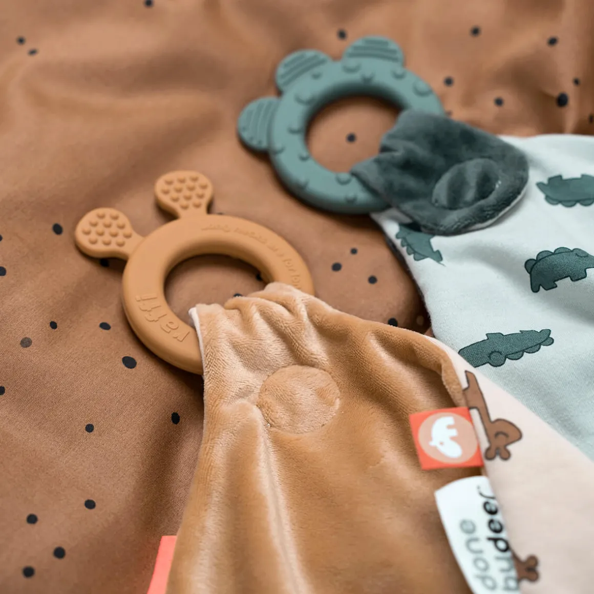 Den søde bidering i silikone med girafører og forskellige strukturer, der stimulerer og beroliger kløende gummer, kan tages af og bruges alene. Der er en praktisk velcrolukning og en elastisk løkke til at fastgøre en sut, som man kan have lige ved hånden.