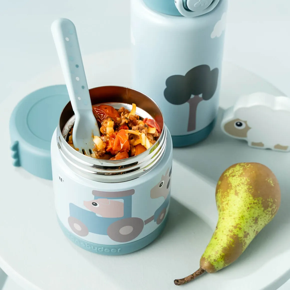 Krukken er i en skøn blå nuance og oplyses af den legesyge duo Dotti og Pigee, som bringer fnis og godt selskab til mellemmåltiderne, uanset hvor dagen går hen.