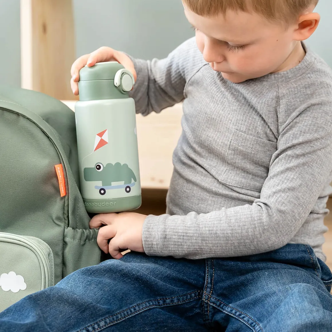 Flasken har en lysegrøn nuance og er dekoreret med den omsorgsfulde Croco og den summende Birdee – de perfekte følgesvende til slurke på farten.