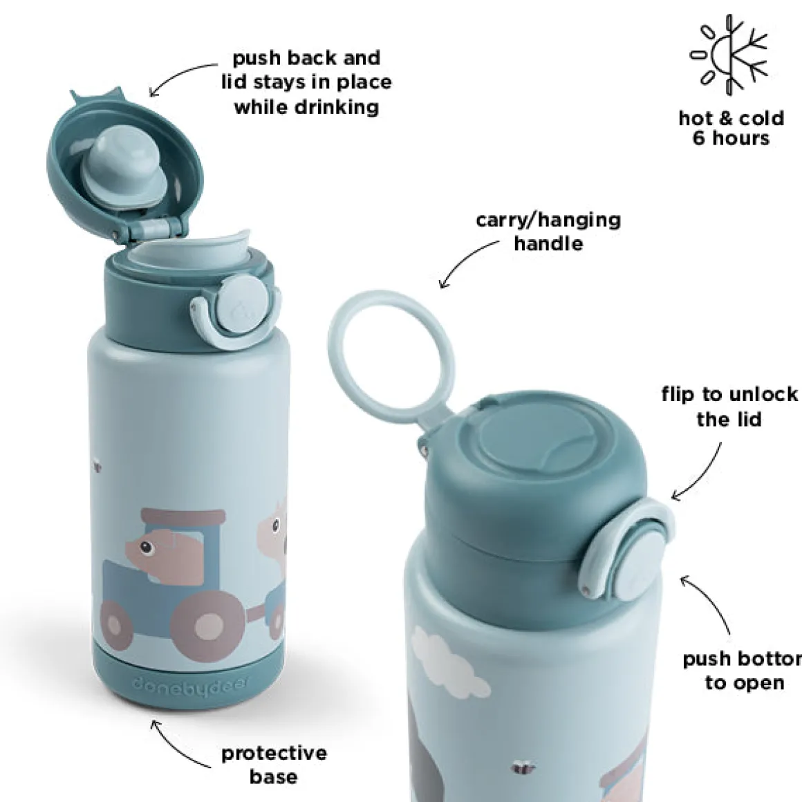 Gennemtænkte detaljer gør det nemt for børn at klare sig selv: et låg med trykknap, der er designet til små fingre, en sikker silikoneforsegling, der forhindrer spild i rygsække, og et praktisk bærehåndtag til livet på farten. Flasken holder drikkevarerne præcis, som dine børn kan lide dem – varme eller kølige – i op til seks timer, når de er på farten. Med plads til 340 ml er det den perfekte størrelse til at holde sig forfrisket hele dagen, fra morgenmaden til legetiden om eftermiddagen.