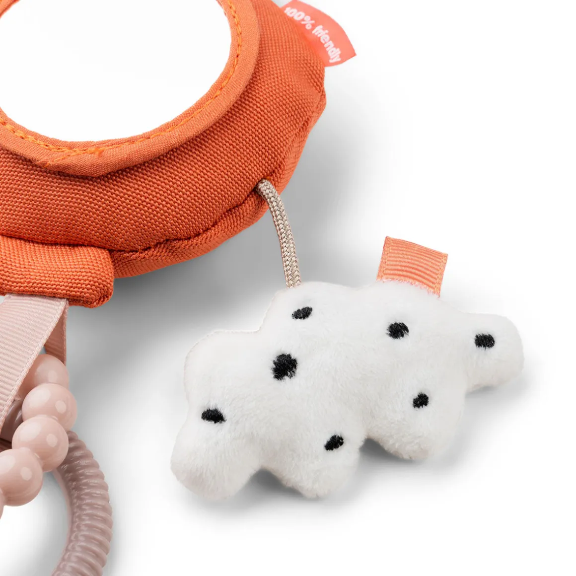 Aktivitetsspejlet har en ballonrangle, en blød tekstureret Ozzo og sky, to teksturerede ringe og sjove tags. Barnet kan nemt gribe fat i ringene og holde aktivitetsspejlet. Brug Ophængsringen til at fastgøre det til barnevognen, autostolen eller mavepuden.