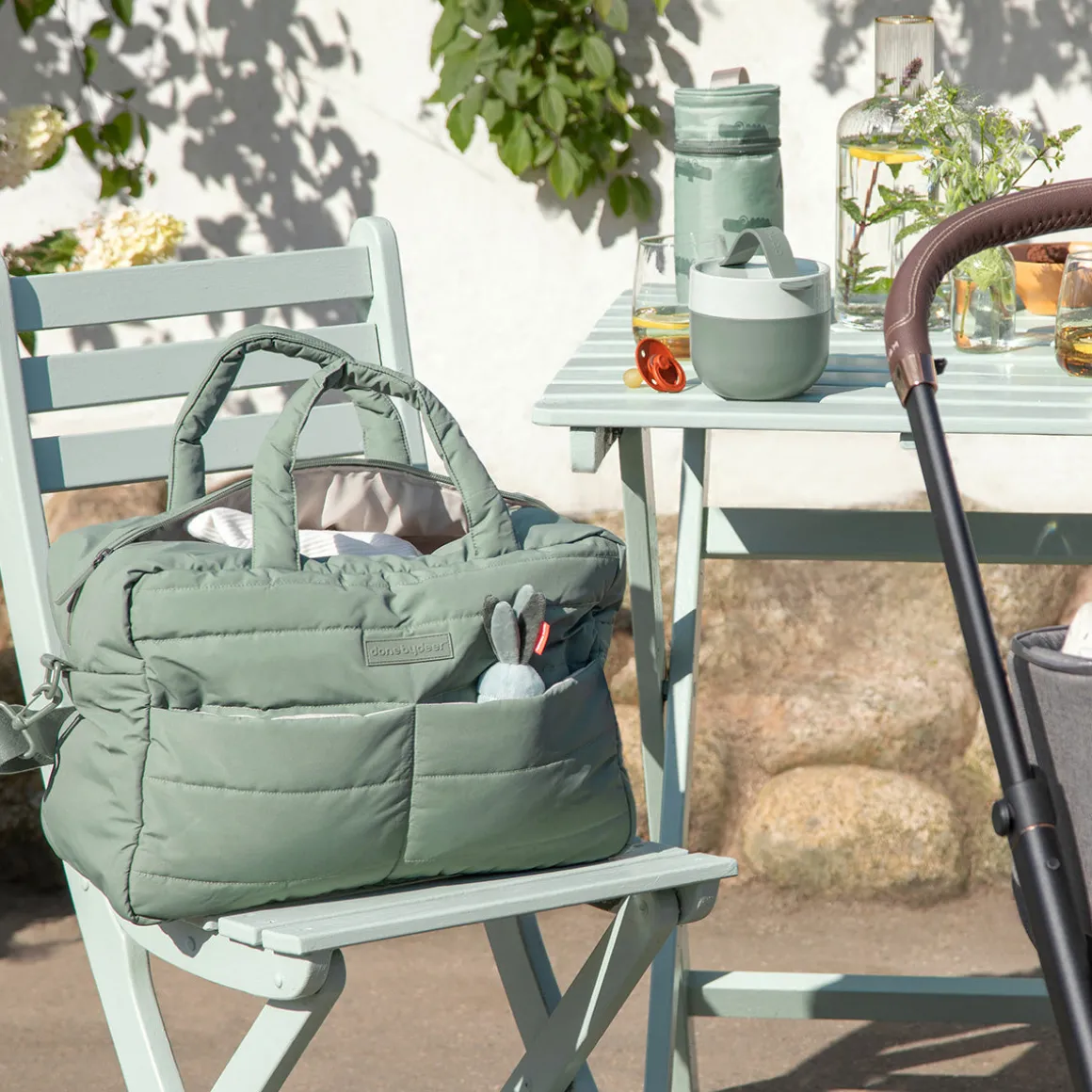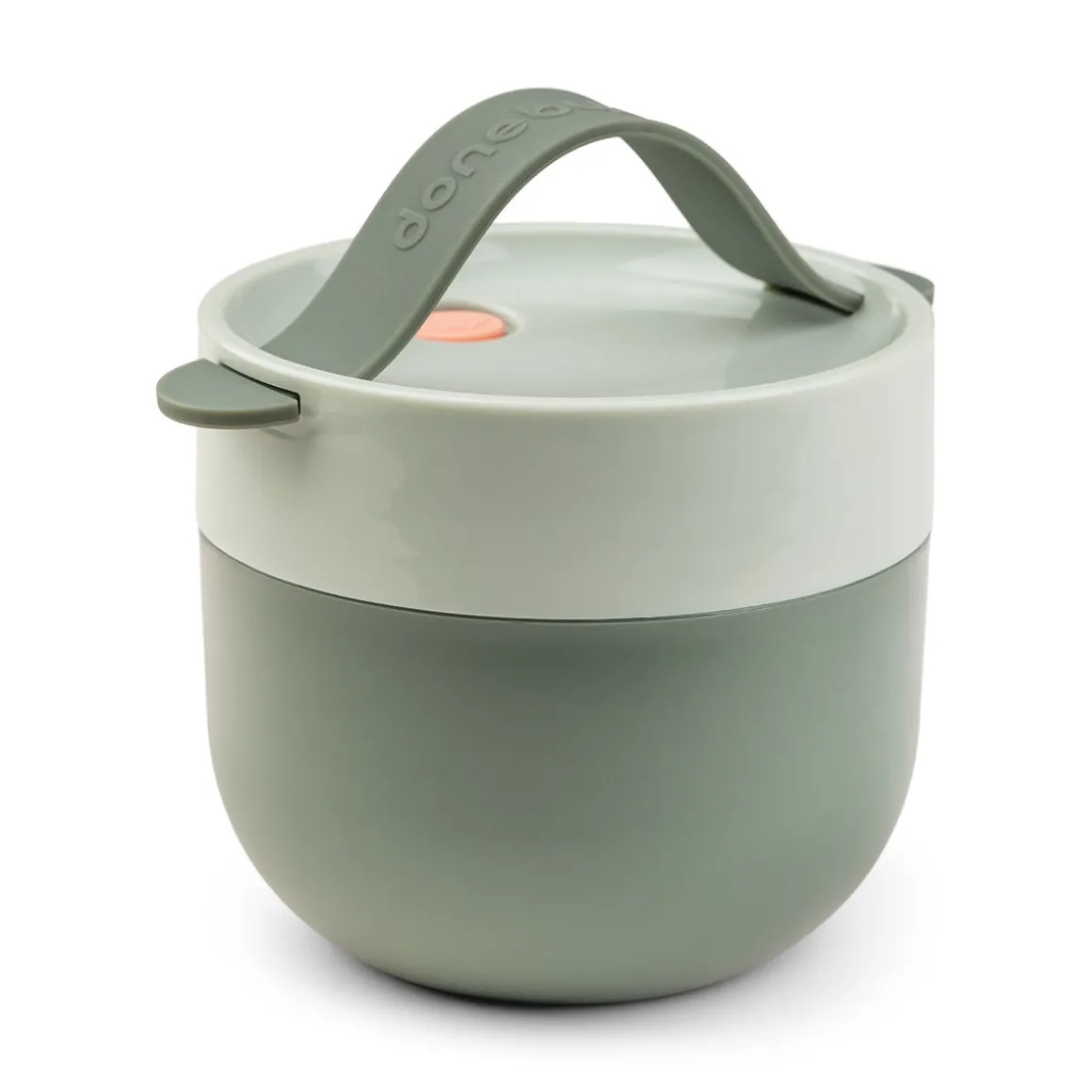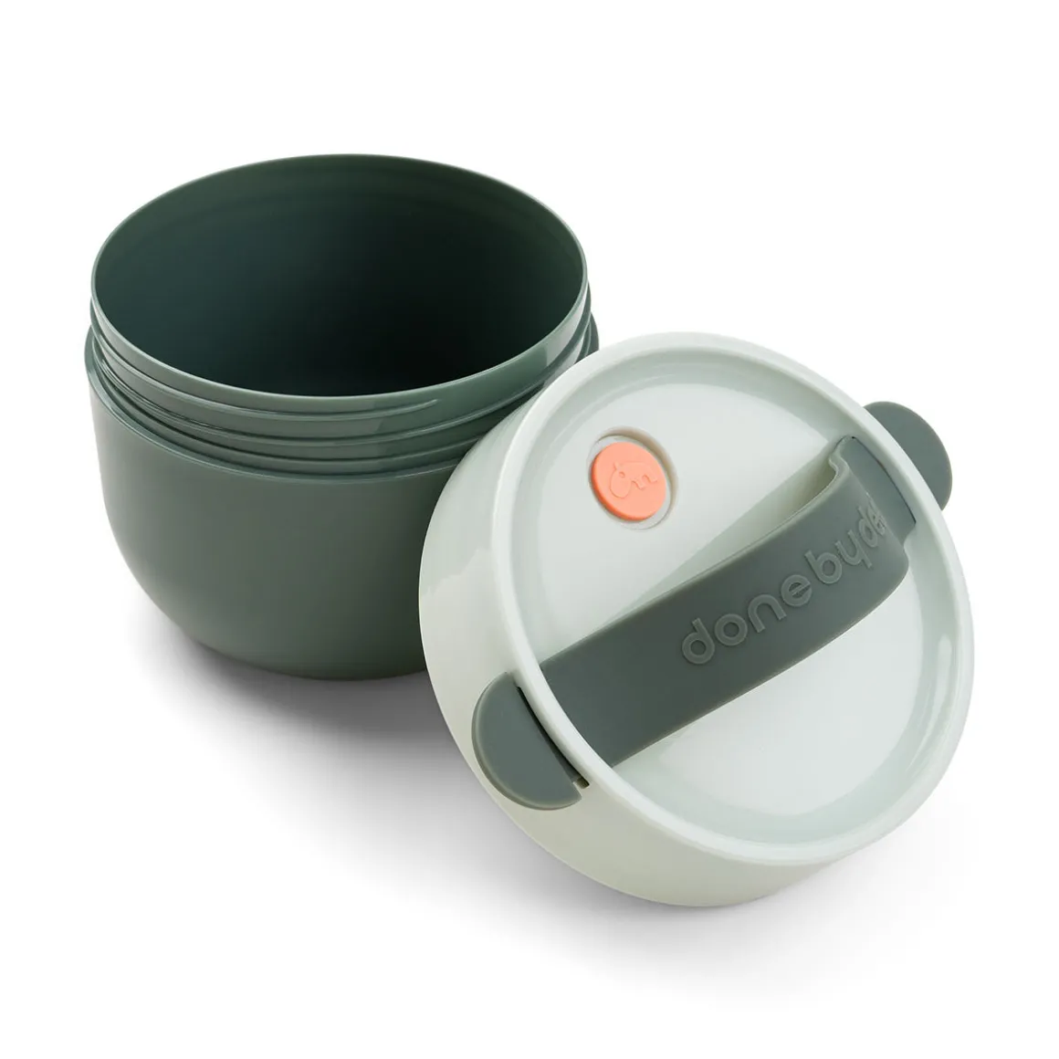 To go madbeholderen har et rent design i moderne farver. Et skruelåg holder godbidderne inde. Det aftagelige bærehåndtag i silikone gør det nemt for barnets hænder at bære skålen.