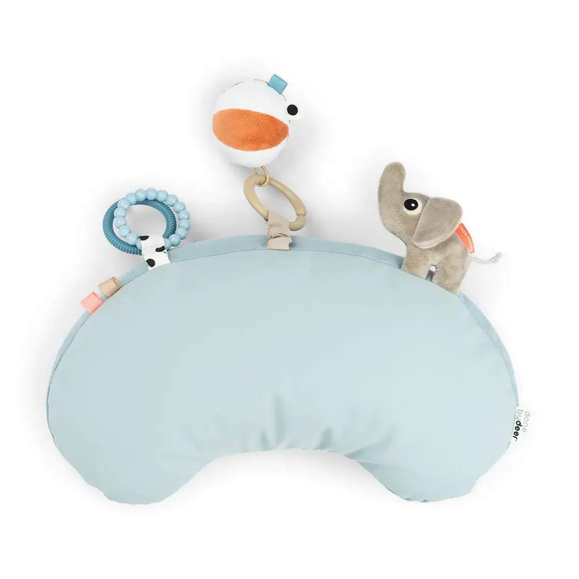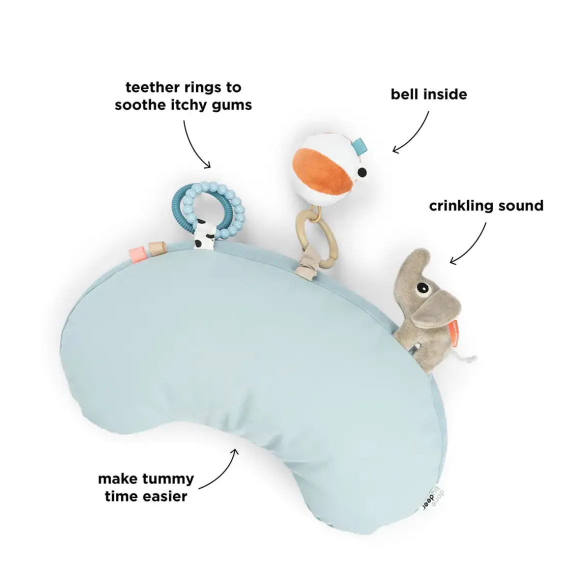 The pillow’s rings can be used as teethers, soothing itchy gums, while the durable canvas material and soft top provide gentle support for your baby’s delicate skin. With lovely blue hues and colourful details, it offers visual stimulation, while Elphee and the attached toys keep your little one entertained as they grow stronger.
